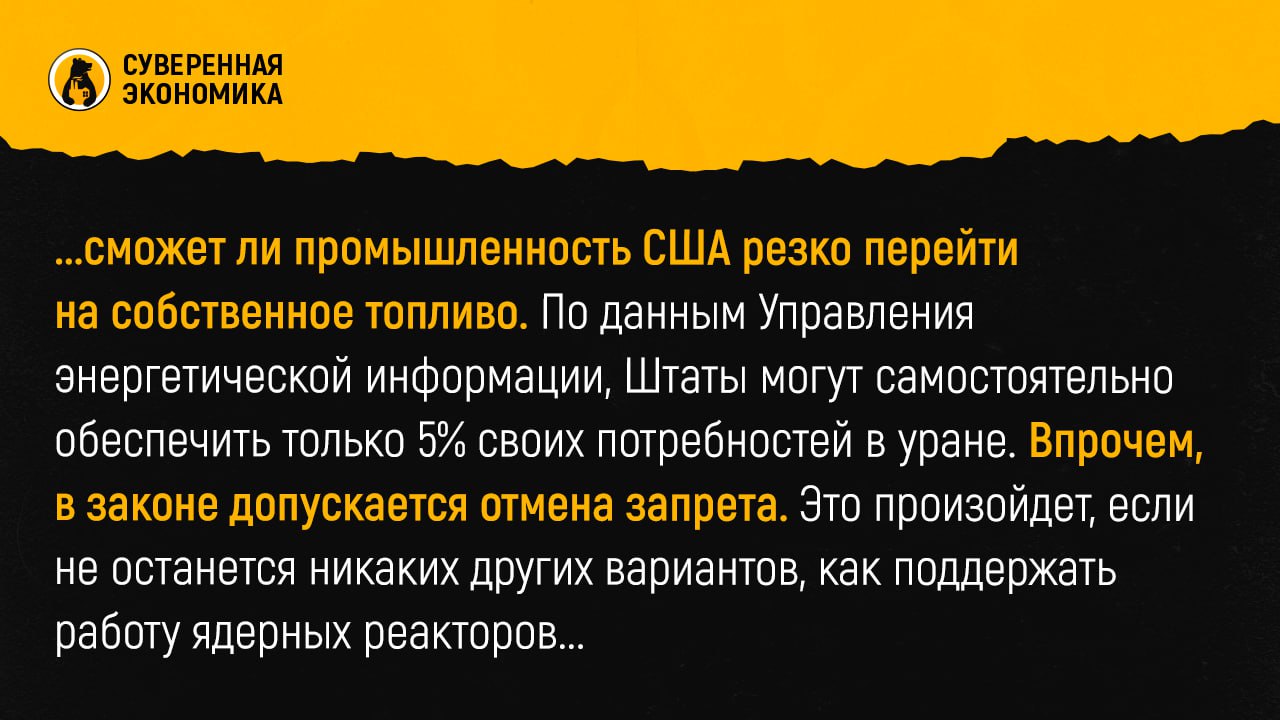 🏭Вашингтону нужно обогащать или искать новых поставщиков — палата представителей Конгресса одобрила запрет на импорт урана из России Штаты планируют прекратить поставки ядерного топлива из нашей страны. Такое решение уже одобрила нижняя палата. Теперь дело только за Сенатом и Джо Байденом. Демократы и республиканцы сошлись во мнении, что российский уран — критическая угроза нацбезопасности США. Наверное, поэтому Штаты вдвое нарастили закупку этого топлива у РФ в этом году. Только за первое полугодие они приобрели у нашей страны 416 тонн. У запрета на поставки из России урана есть выгодополучатели — это, например, американская Centrus Energy, предприятие ConverDyn. Другой вопрос — сможет ли промышленность США резко перейти на собственное топливо. По данным Управления энергетической информации, Штаты могут самостоятельно обеспечить только 5% своих потребностей в уране. Впрочем, в законе допускается отмена запрета. Это произойдет, если не останется никаких других вариантов, как поддержать работу ядерных реакторов.
