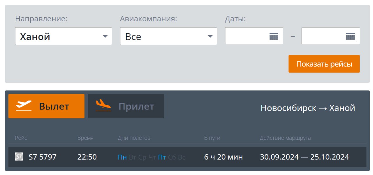 ✈️ 🇻🇳 S7 осенью может полететь во Вьетнам из Новосибирска — в расписании аэропорта появился прямой рейс в Ханой с 30 сентября, заметили @vandroukiru.