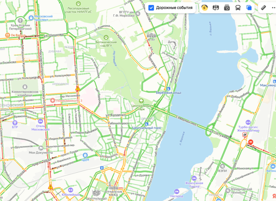 5-километровая пробка скопилась на Московском проспекте в Воронеже сегодня утром, 27 ноября, если верить данным сервиса «Яндекс карты».