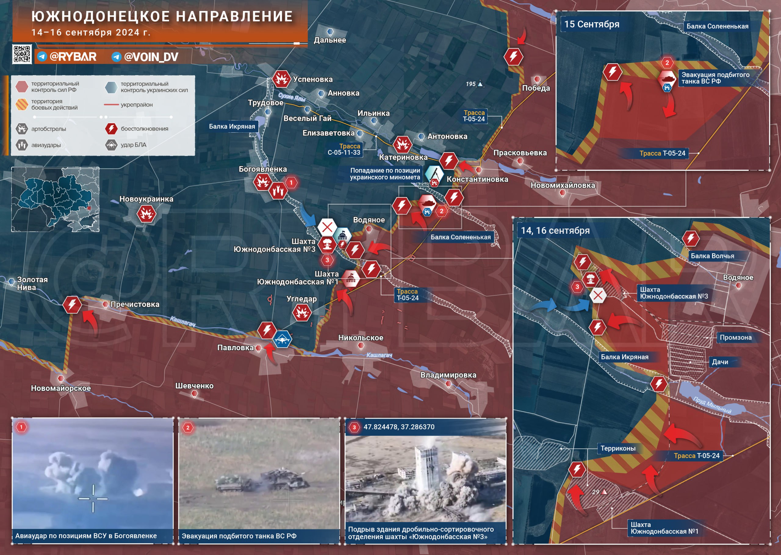Продолжаются бои и в районе шахты «Южнодонбасская №1», в окрестностях которой также несколько была расширена зона контроля. По восточным окраинам и и северной части угледарских дач ВС РФ наносят множественные удары авиацией и артиллерией, идут бои. Сопротивление украинских формирований остается достаточно серьезным.