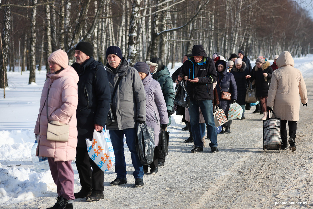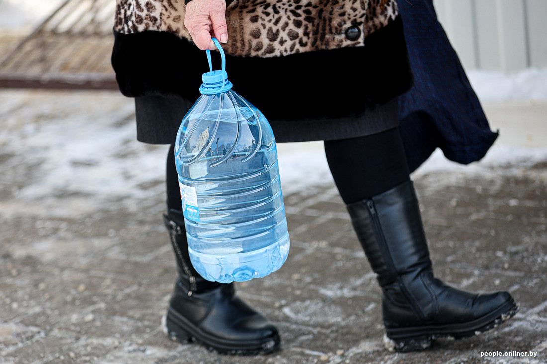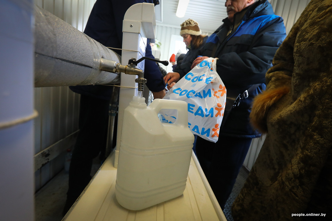 Воду в банки и бутылки разливали через краники на улице. Люди справлялись быстро, но количество желающих все никак не уменьшалось. По словам Сергея, пришедшего с близкими, в очереди он простоял порядка 30 минут.