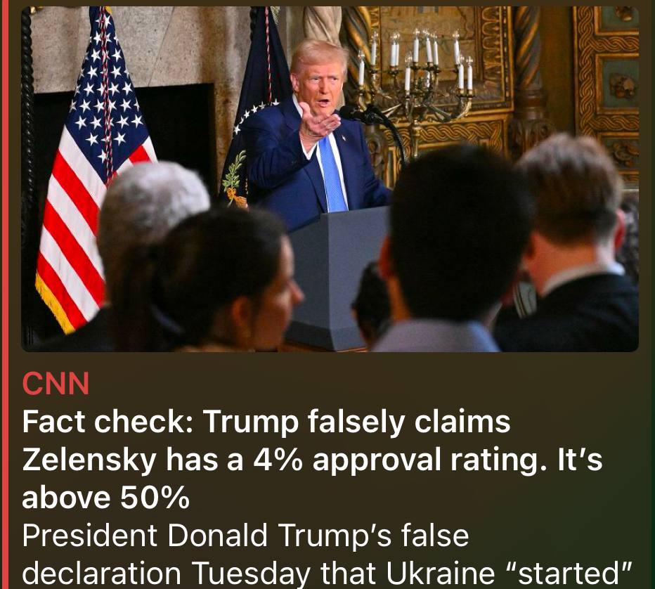Проверка фактов: Трамп ложно утверждает, что рейтинг одобрения Зеленского составляет 4%. На самом деле он выше 50%