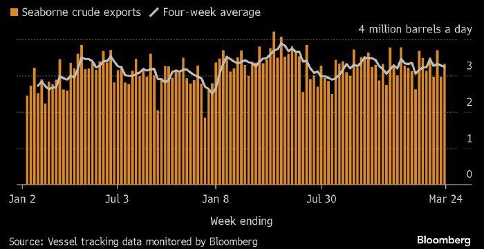 Морской экспорт нефти из России восстанавливается несмотря на ужесточение санкций. Объем морского экспорта нефти из РФ отыграл примерно половину потерь предыдущей недели.