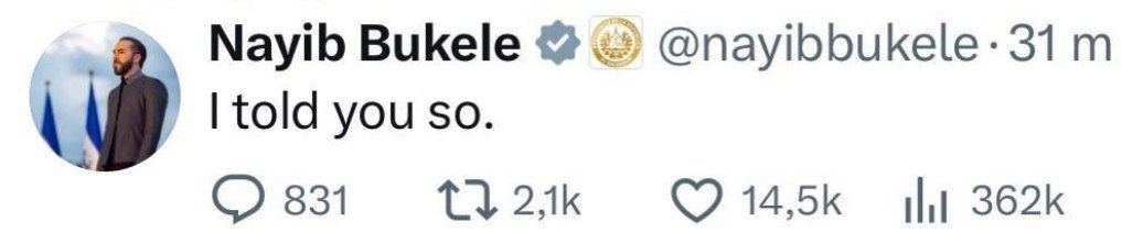 Президент Сальвадора Букеле на коне. Он заработал для Сальвадора сотни миллионов долларов на росте биткоина и напоминает, что говорил всем. На счетах Сальвадора биткоинов на полмиллиарда долларов.
