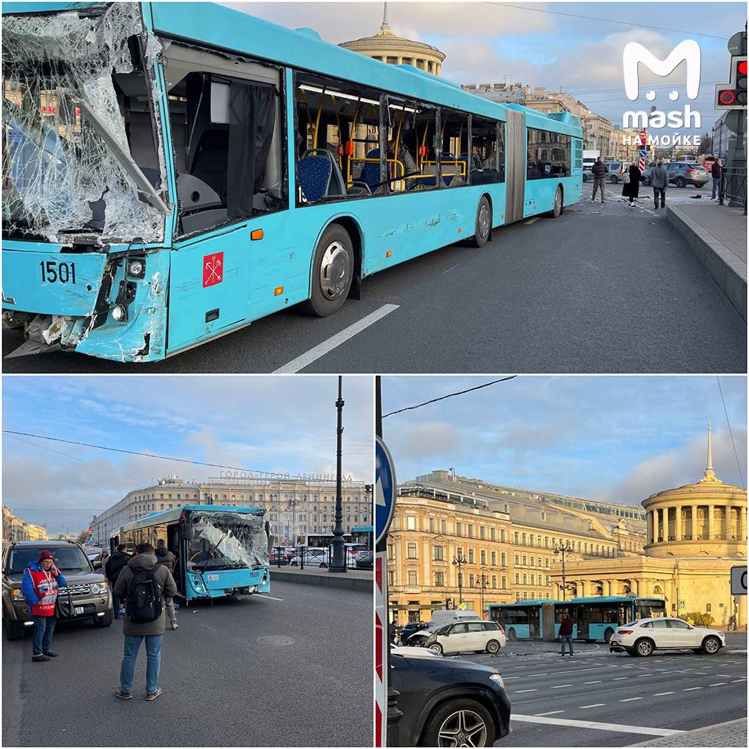 Лазурный автобус сильно пострадал в аварии с двумя легковушками при повороте с Площади Восстания на Лиговский проспект — последствия на фото. По словам очевидцев, в ДТП есть пострадавшие, на месте нескольких скорых.