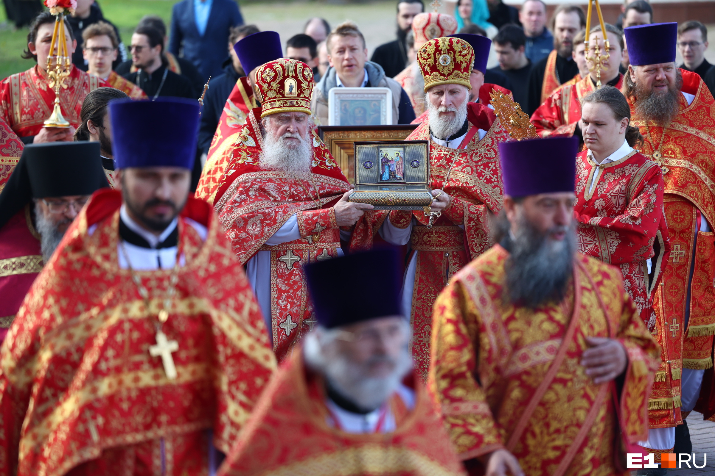 В Екатеринбург утром 29 мая привезли православные святыни: чудотворную икону Богородицы «Казанская» и ковчег с частью пояса Пресвятой Богородицы. Встречу святынь организовали в Храме на Крови. Туда же приехал митрополит Екатеринбургский и Верхотурский Евгений, чтобы совершить Божественную литургию.