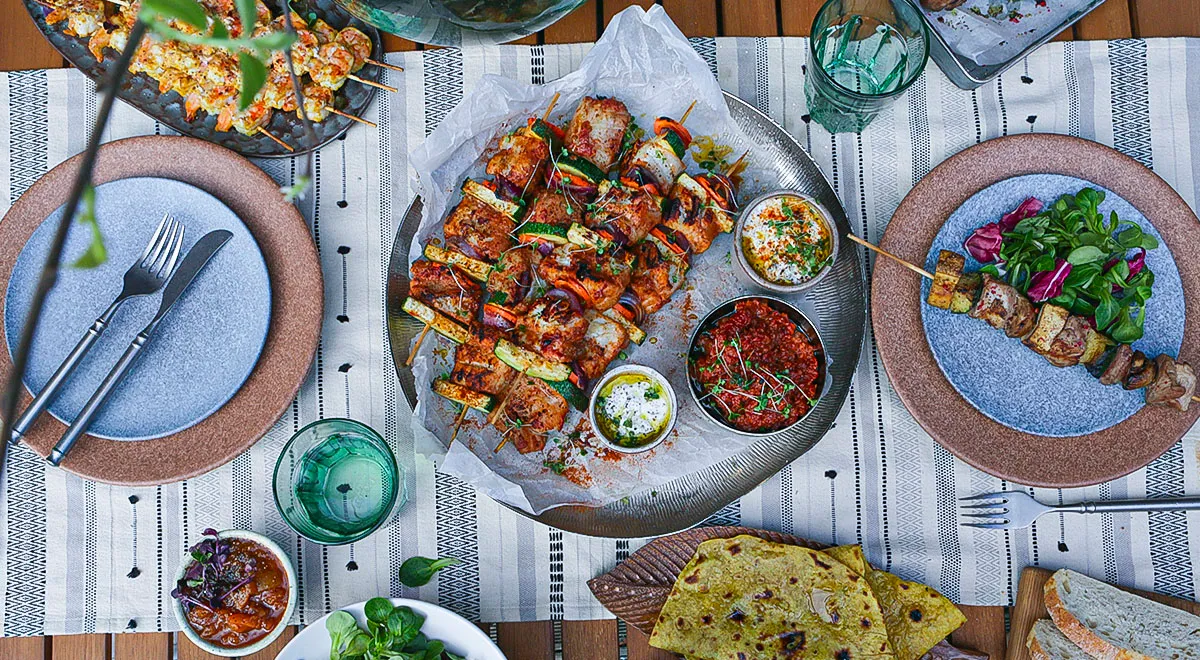 - Подавайте шашлык на листах лаваша с овощной закуской и пряным айраном.
