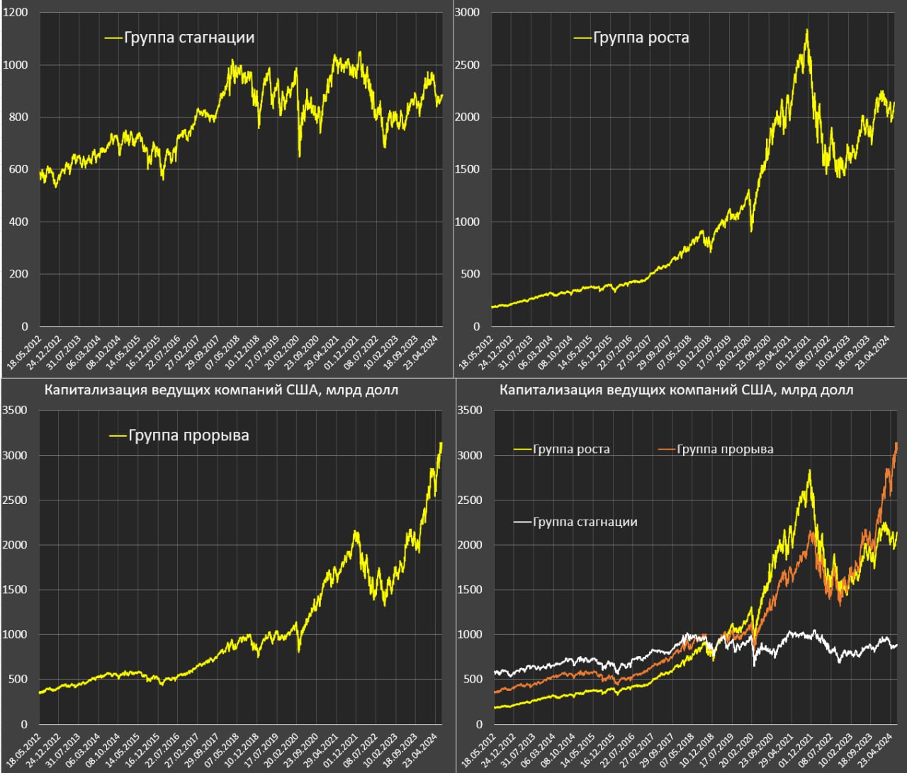 • «Группа прорыв» имеет капитализацию 3.14 трлн vs 2.15 трлн на пике пузыря 2021 и 1.04 трлн в дек.19, с начала года +31.2% или +746 млрд, с начала 2023 +110% или 1.65 трлн.