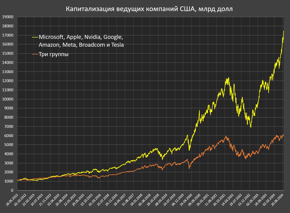Все три группы в совокупности только в июле превысили (6.16 трлн) максимум 2021 (6 трлн), но интересно то, что с янв.12 по фев.15 три группы имели сопоставимую капитализацию с ТОП-7, а сейчас разрыв вырос почти в 2.8 раза или на 10.5 трлн!