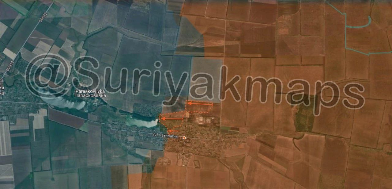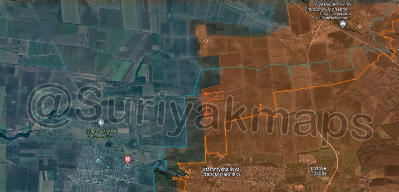 1. Ситуация к юго-западу от Донецка: Российская армия осуществляет продвижение к западу и северу от складов в северной части Новомихайловки.