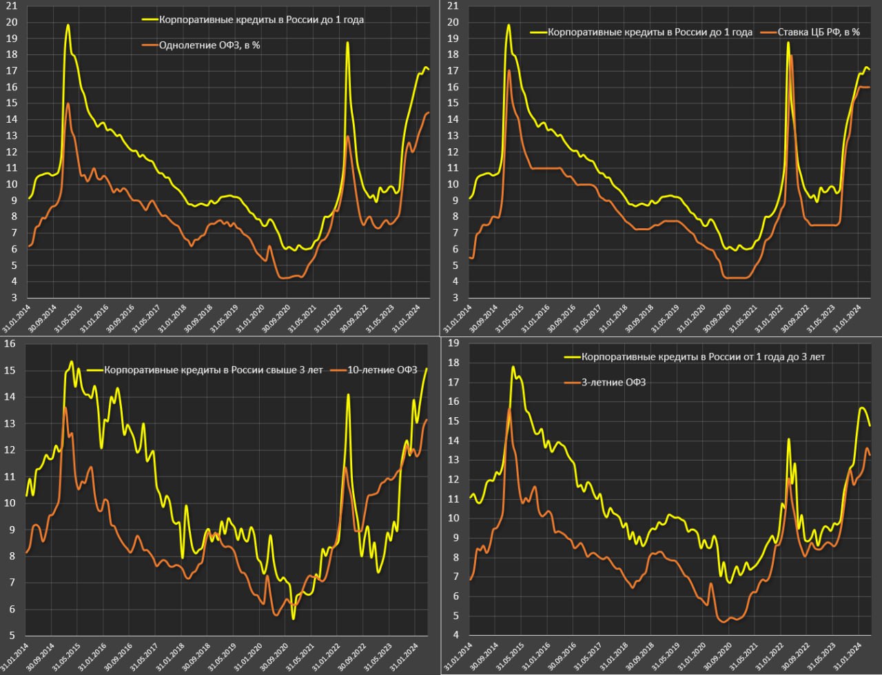 В период с января по июль 2023 (до ужесточения ДКП) средневзвешенные ставки по долгосрочным кредитам были 8.4% - средний положительный спрэд к ключевой ставке около 0.9 п.п, а к 10 летним ОФЗ отрицательный спрэд в 2.4 п.п. В начале 2024 произошла инверсия, к ключевой ставке минус 1.9 п.п, а к 10 летним ОФЗ +1.7 п.п.