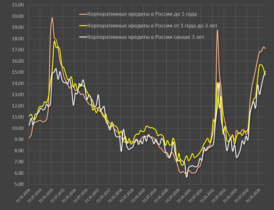 ▪️Корпоративные кредиты свыше 3 лет имели средневзвешенные ставки 15.1% в апреле 2024 (с начала года в среднем 14.1%), а более высокая стоимость кредитов была только один раз (как минимум за последние 20 лет) в марте 2015.