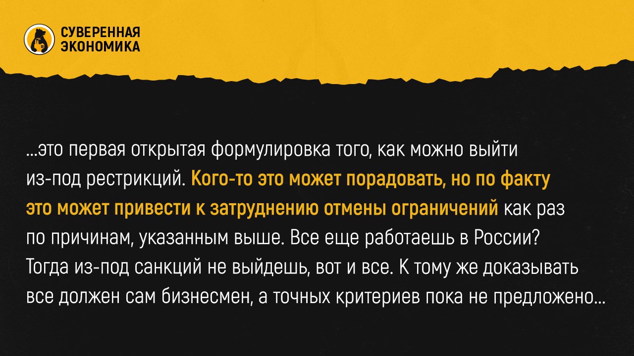 Юристы отмечают, что это первая открытая формулировка того, как можно выйти из-под рестрикций. Кого-то это может порадовать, но по факту это может привести к затруднению отмены ограничений как раз по причинам, указанным выше. Все еще работаешь в России? Тогда из-под санкций не выйдешь, вот и все. К тому же доказывать все должен сам бизнесмен, а точных критериев пока не предложено. Иными словами, решение об отмене санкций останется сугубо политическим. Другой вопрос — а выгодно ли предложенное Советом ЕС решение в свете активного обсуждения мирного соглашения?