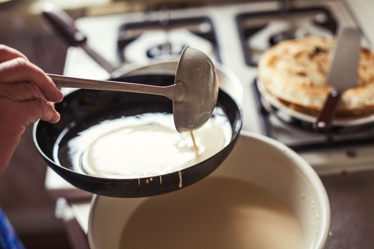 4. Слишком холодная сковорода приведёт к тому, что блины будут прилипать и плохо пропекаться, а слишком горячая — к тому, что они быстро сгорят. Идеальная температура — это средний огонь.