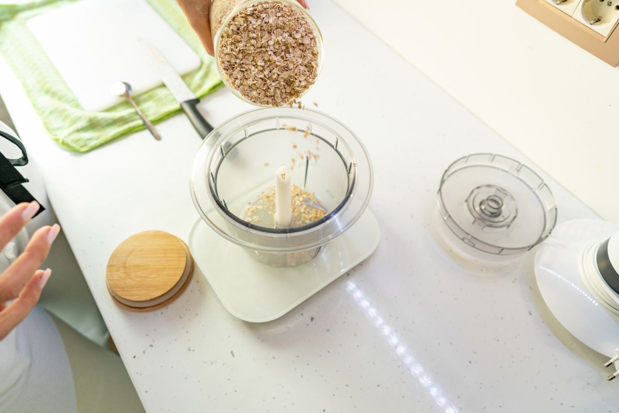1. Овсяные хлопья измельчите блендером или кофемолкой в муку, в глубокой посуде смешайте все составляющие.
