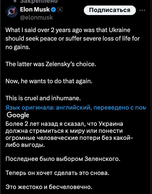 Маск обвинил Зеленского в нежелании стремиться к миру, что «жестоко и бесчеловечно».