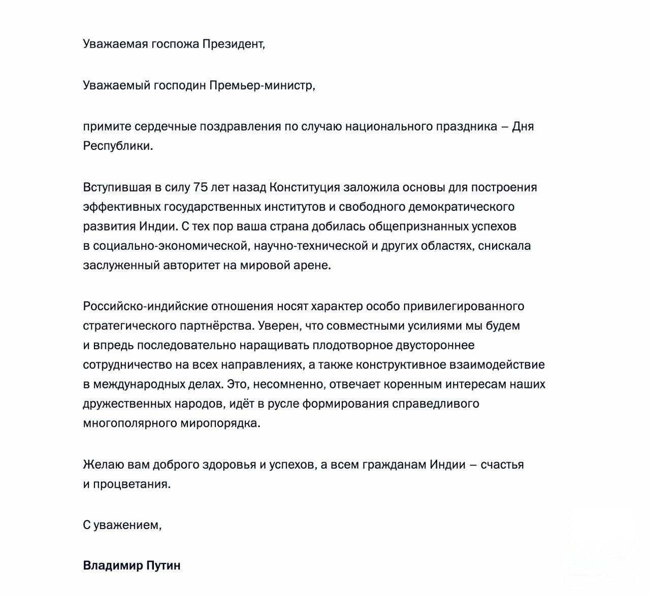Владимир Путин поздравил президента и премьер-минстра Индии с Днем Республики. Страна отмечает 75-летие своей конституции.