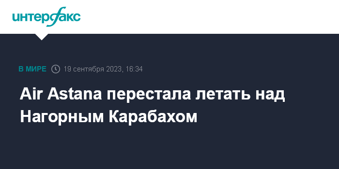 Москва. 19 сентября. INTERFAX.RU - Из-за нестабильной обстановки в Нагорном Карабахе рейсы группы авиакомпаний Air Astana в Турцию, Европу и Израиль выполняются в облет этой территории, сообщил казахстанский авиаперевозчик.