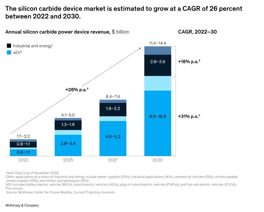 Аналитики "Центра поддержки общественных и гражданских инициатив" (ЦПОГИ) подсчитали: мировой рынок силовых полупроводников на основе SiC сейчас оценивается в $2 млрд, и половину покупают автозаводы. Среди них такие гиганты как Tesla, Mercedes, Hyundai, BYD. Однако уже к 2030 году, по прогнозам ЦПОГИ, спрос на карбид кремния вырастет на порядок.
