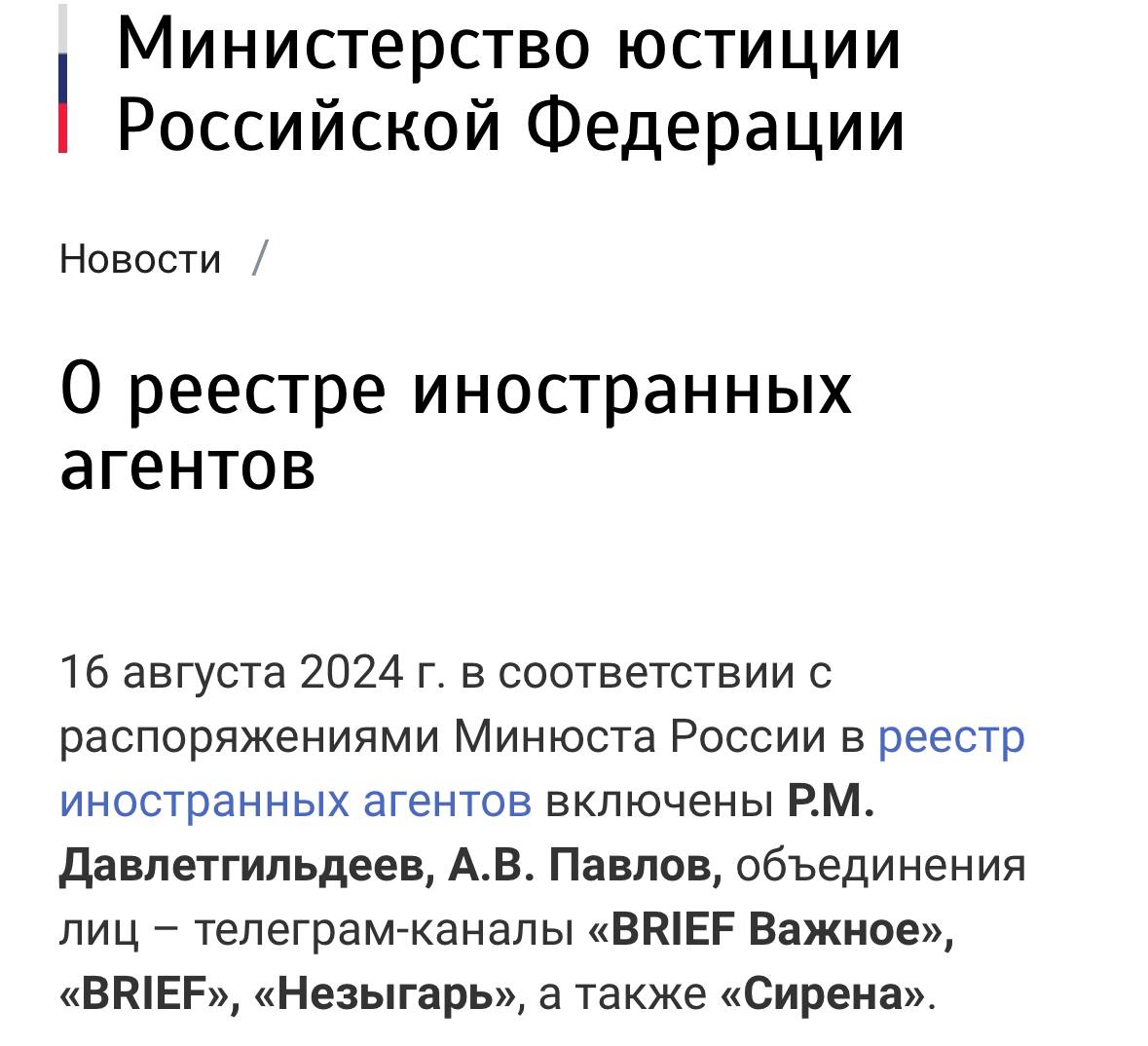 ❗️Telegram-каналы «BRIEF Важное», «BRIEF», «Незыгарь», а также «Сирена», внесены в реестр иноагентов — Минюст РФ