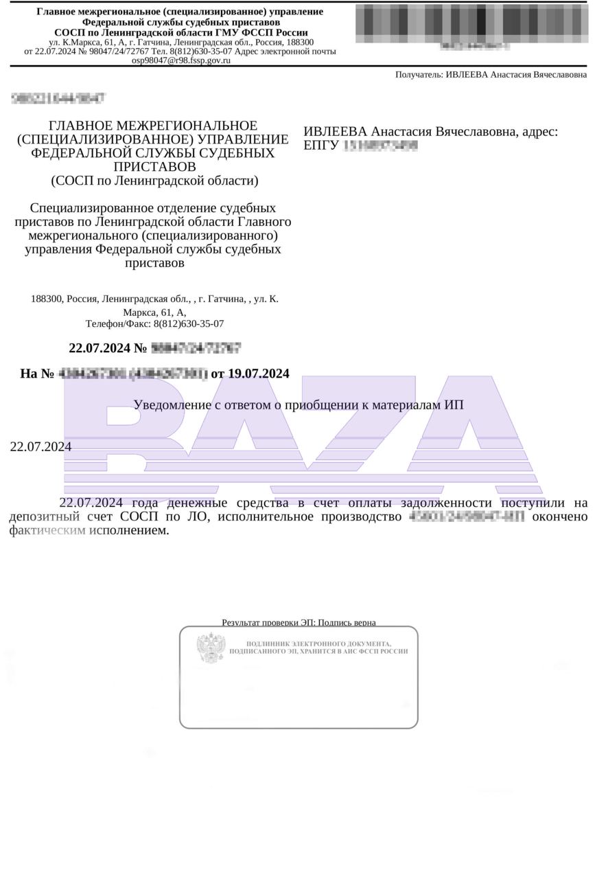 На 19 июля у Ивлеевой значился долг в размере 20,9 млн рублей — с конца мая он вырос почти в два раза. Ведущей, блогерке, актрисе и предпринимательнице грозил запрет на выезд из России и арест счетов, поэтому Настя подсуетилась: часть долга (более 11 млн рублей) Ивлеева оплатила 19 июля, ещё 8,6 млн отправила в начале этой недели. Деньги уже дошли до ФССП.