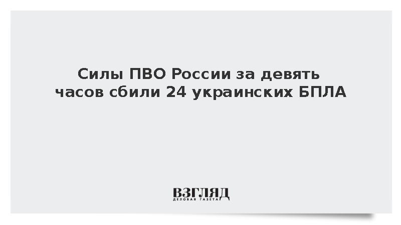 Дежурные расчеты ПВО в течение девяти часов сбили 24 украинских беспилотных летательных аппарата самолетного типа, сообщает Минобороны.