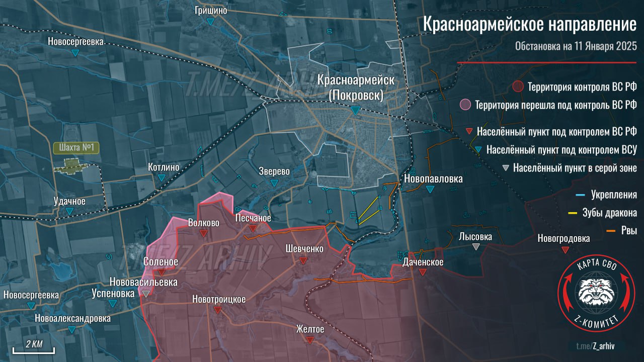 1. Красноармейское направление. ВС РФ продолжают методично расширять охват города с юга, приближаясь к Котлино и Удачному. Идут тяжелые бои, но остановить наступление ВС РФ противник так и не сумел.