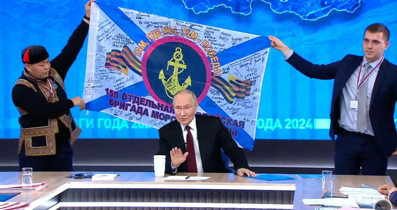 Владимир Путин отметил, что рассчитывал на вопросы подобного рода, и благодарен «за возможность показать, что происходит и что делают наши ребята на линии боевого соприкосновения». Президент продемонстрировал копию боевого знамени, которое ему передали бойцы 155-й бригады морской пехоты Тихоокеанского флота.