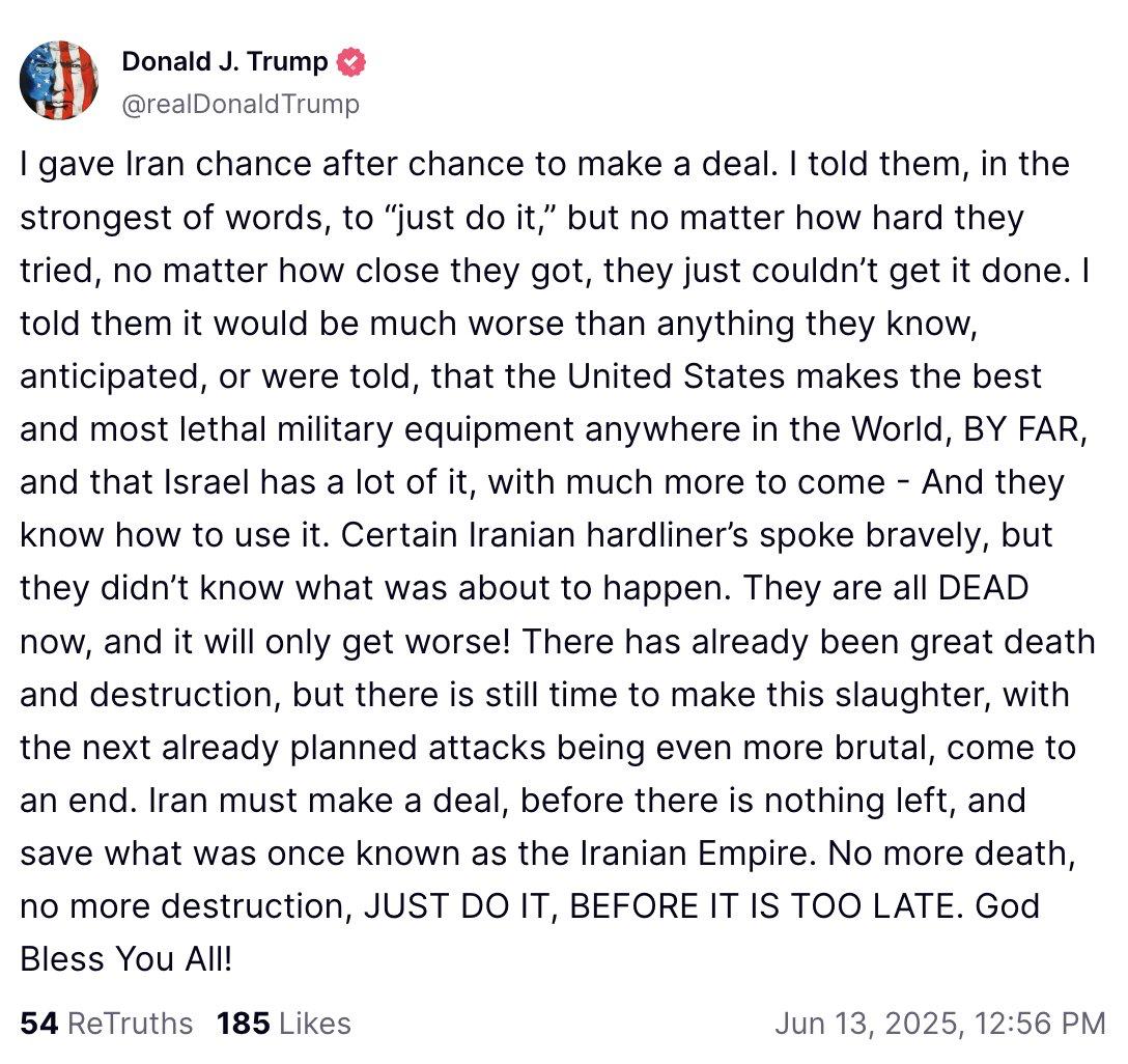 Трамп об Иране: Я давал Ирану много шансов заключить сделку. Я настоятельно предупреждал их «просто сделать это», но они не справились. Я говорил, что это будет хуже, чем они ожидали. США производят самое лучшее и смертоносное оружие — у Израиля его много, и на подходе еще больше. Некоторые иранские сторонники жесткой линии говорили жестко, но теперь они все МЕРТВЫ. Будет еще хуже. Уже произошли большие разрушения, но сделка все еще может остановить следующие жестокие атаки. Иран должен действовать сейчас, чтобы спасти то, что осталось от его империи. Больше никаких смертей, больше никаких разрушений. ПРОСТО СДЕЛАЙТЕ ЭТО, ПОКА НЕ СТАЛО СЛИШКОМ ПОЗДНО. Олег Царёв. Подписаться.
