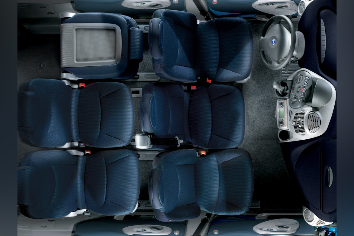 Новая Мультипла была очень нестандартной с точки зрения компоновки. Во-первых, при длине меньше четырёх метров она обладала шестью полноценными посадочными местами (3+3), из-за чего «ручник» переехал из центра машины к водительской двери, а пассажирская подушка безопасности была рассчитана на двух человек.