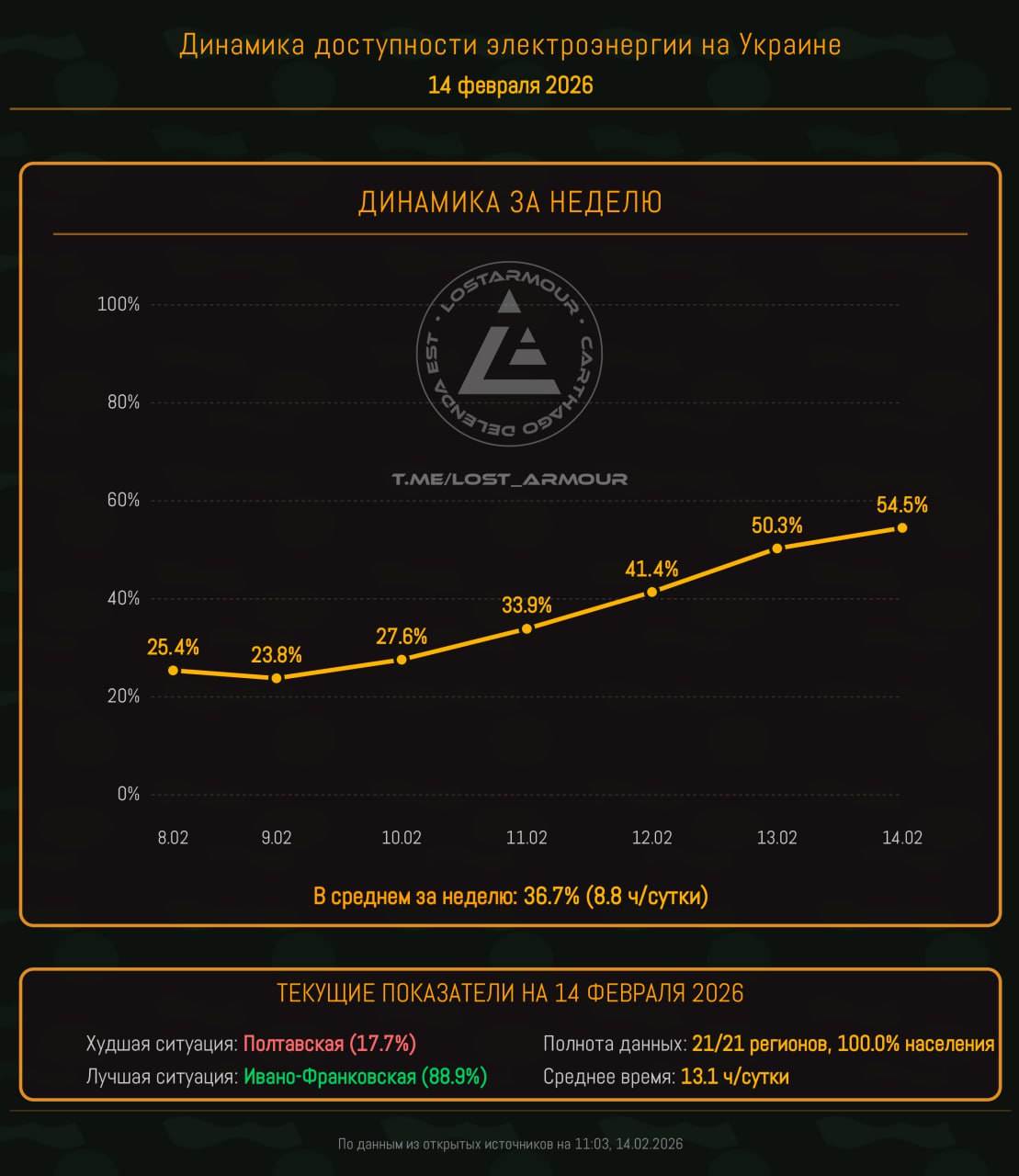Инфографика доступности электроэнергии на территории Украины по областям на 14 февраля 2026.