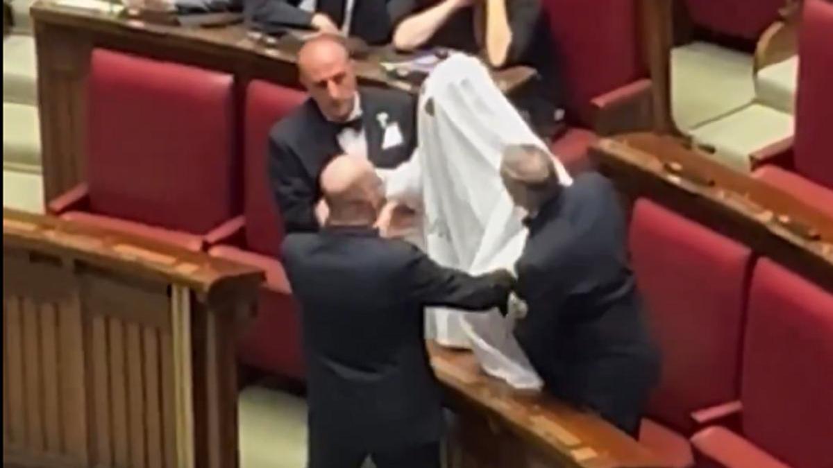 Секретарь левой оппозиционной партии "+Европа" Риккардо Маджи вошел в зал заседания с простыней на голове, притворяясь привидением. Он направился к трибуне, где находилась премьер, выкрикивая упреки в ее адрес в связи с предстоящим 8-9 июня референдумом по пяти вопросам, касающимся гражданства и трудового законодательства.
