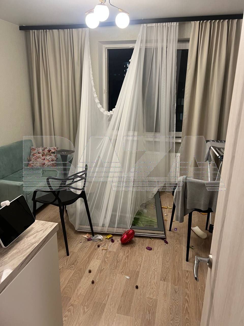 Жители квартиры в Сапроново (это подмосковный город Видное) разбирают квартиру после взрыва беспилотника. Хозяину квартиры — Владиславу посекло руки осколками стекла.