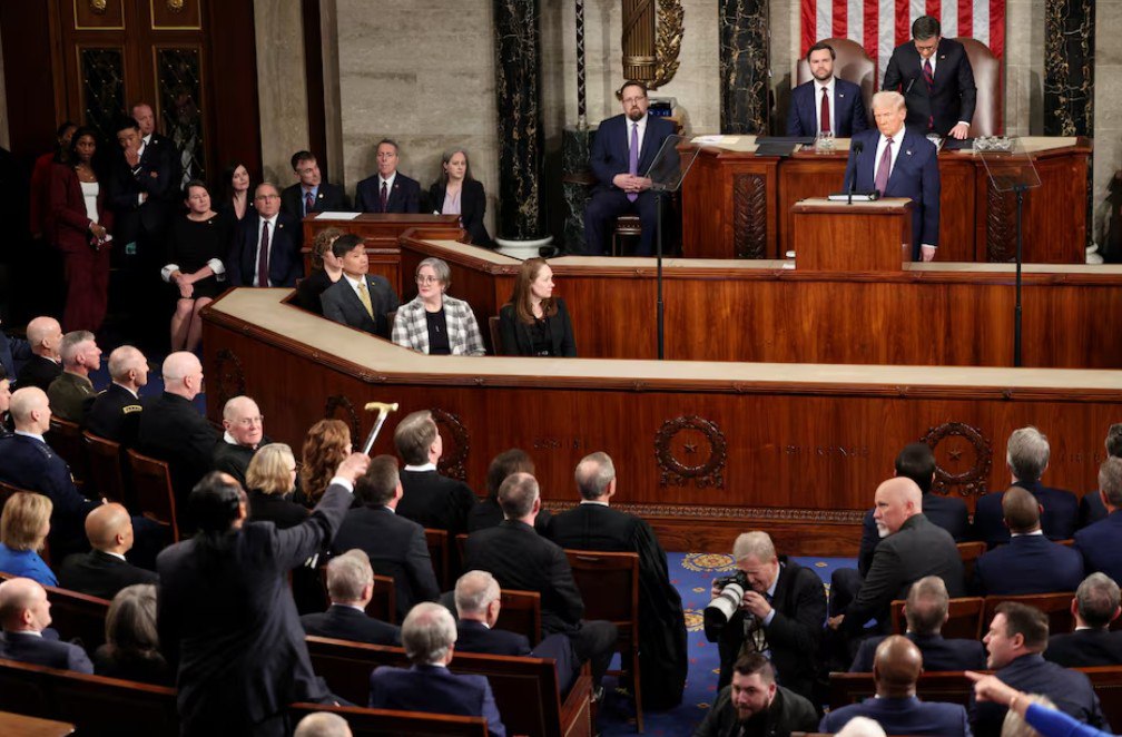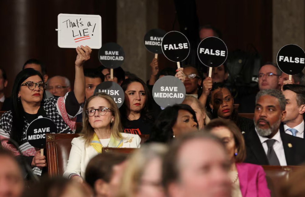 Демократы пришли на выступление Трампа с табличками «защитите ветеранов», «ложь» и «Маск ворует».
