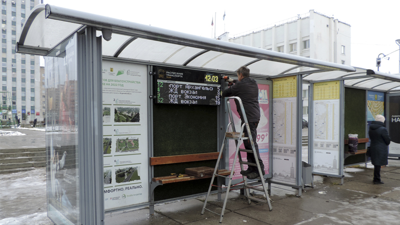 На текущий момент, по словам руководителя рекламной фирмы Сергея Долгобородова, электронными маршрутными табло оснащены шесть остановочных комплексов в центральной части города. Сегодня удобной цифровой панелью обзавелся автобусный павильон у театра драмы на Троицком проспекте. Ранее аналогичные устройства появились на остановках «Орбита», «Петровский парк», «Тимме-Воскресенская», «ул. Поморская» и «пл. Ленина».