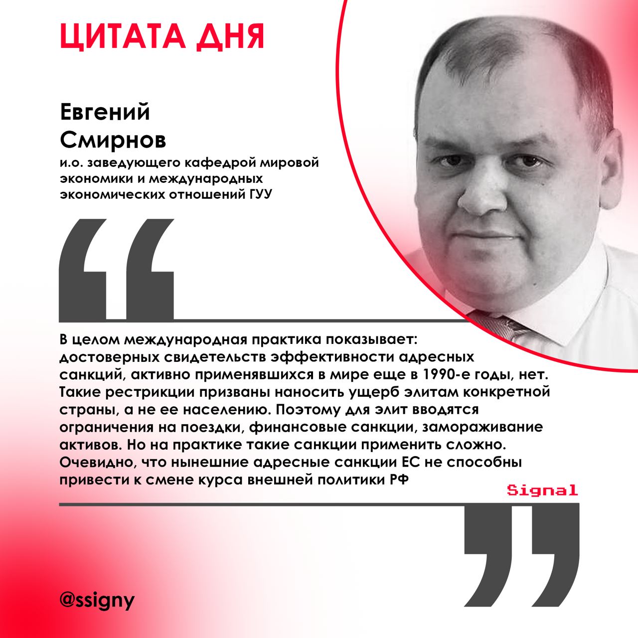 Доктор экономических наук, профессор, и.о. заведующего кафедрой мировой экономики и международных экономических отношений Государственного университета управления Евгений Смирнов заявил о неэффективности адресных санкций, вводимых США и ЕС против России. По его словам, такая практика в мировой политике доказала свою несостоятельность еще 30 лет назад. По его словам, уже сейчас можно констатировать, что санкциям так и не удалось повлиять на внешнюю политику РФ, а нынешний пакет ограничений носит скорее символический характер.