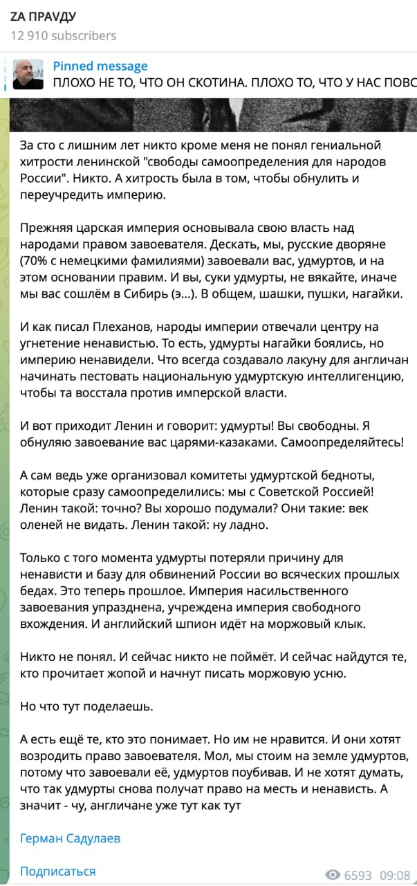 В пример Садулаев почему-то приводит удмуртов, коих русские якобы мучали до революции.