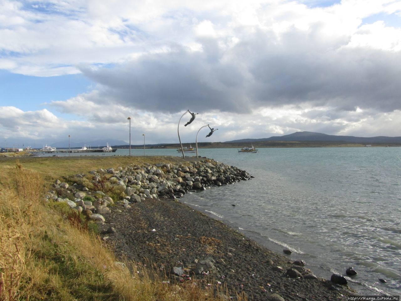 Городок небольшой, ночевать второй раз здесь не имело смысла. Начиная с двух часов, сегодня мы проехали 135 км до Пуэрто Наталеса и далее еще «немного, еще чуть-чуть» до Пунта Аренаса, преодолев в общей сложности свыше 300 км. Пуэрто Наталес встречает нас скульптурной композицией ныряльщиков на набережной вдоль Залива Последней Надежды.