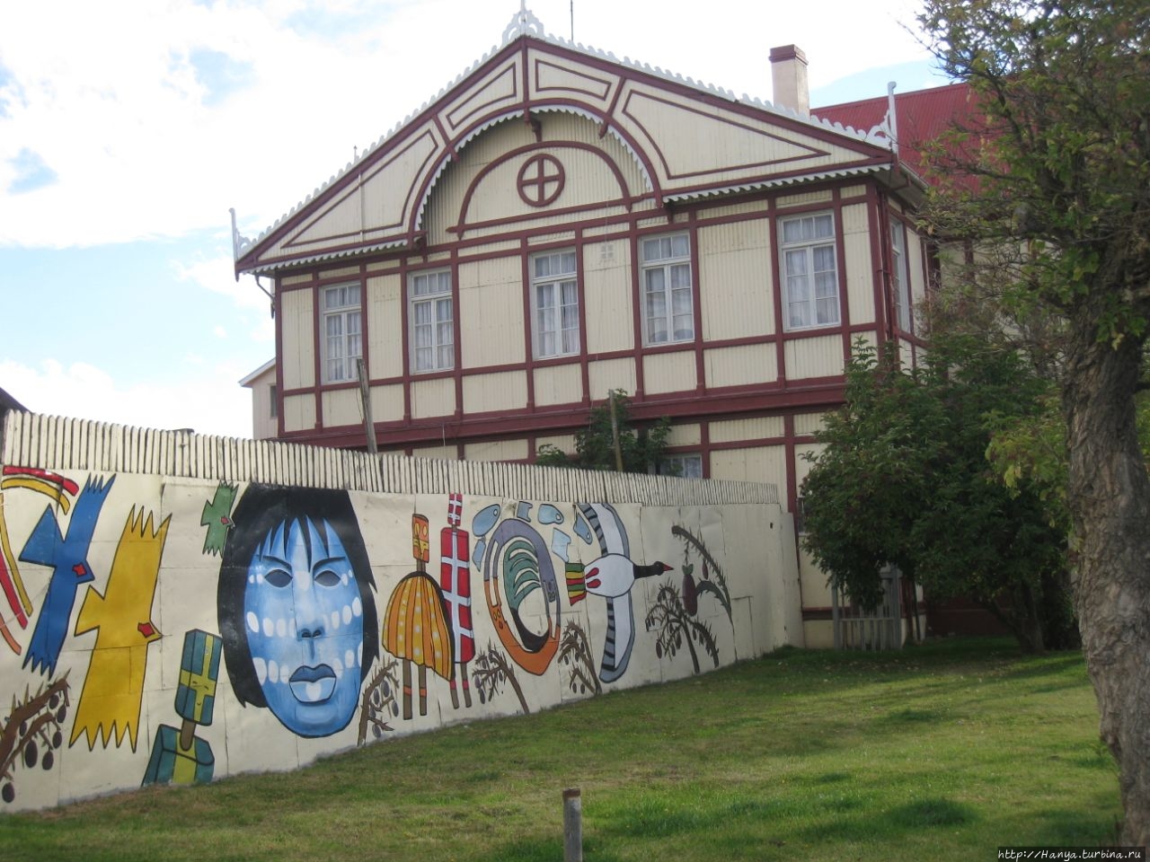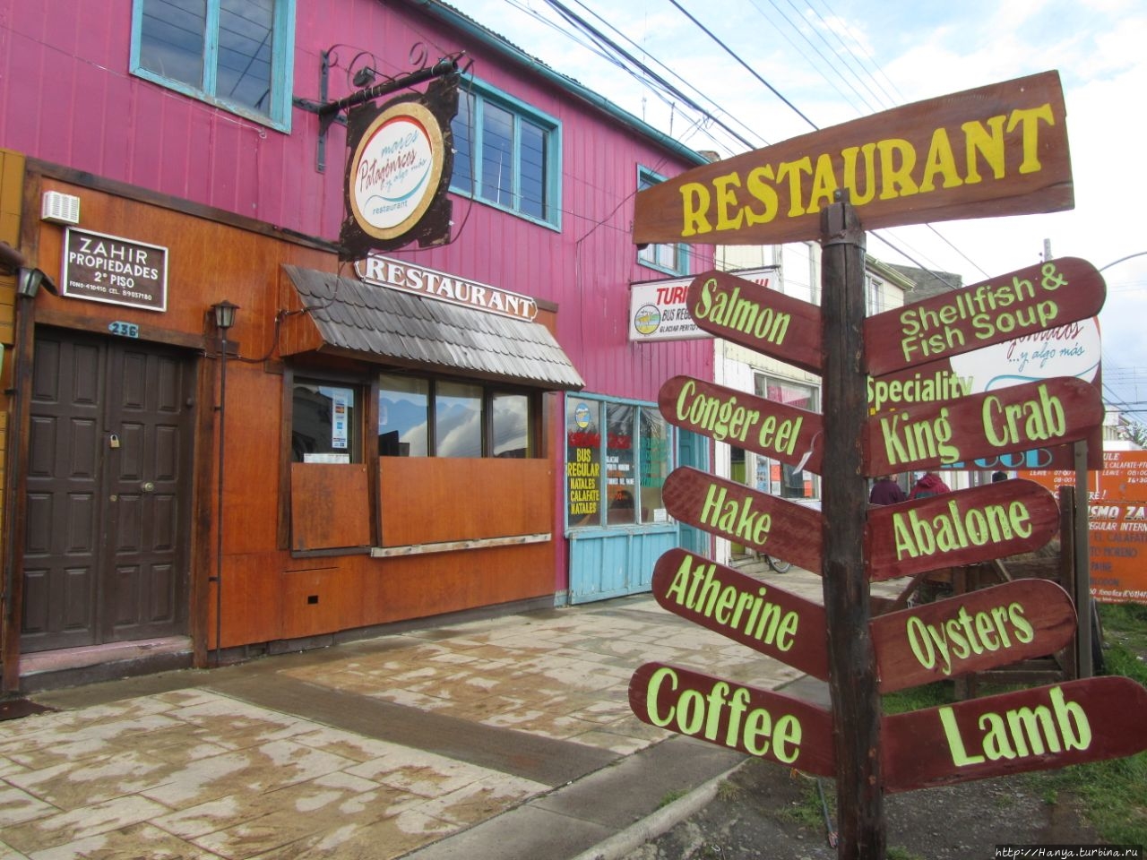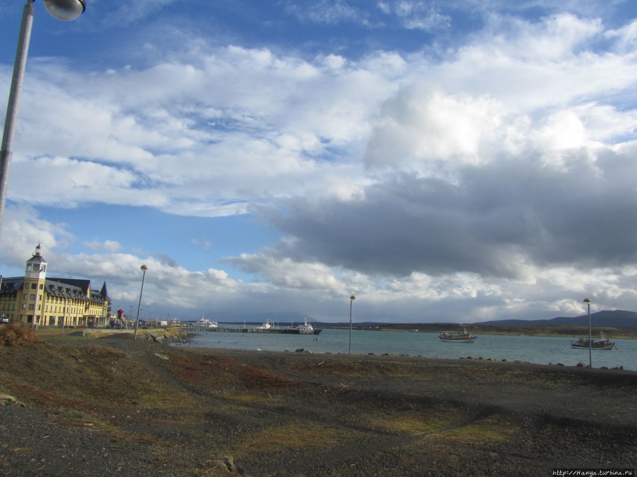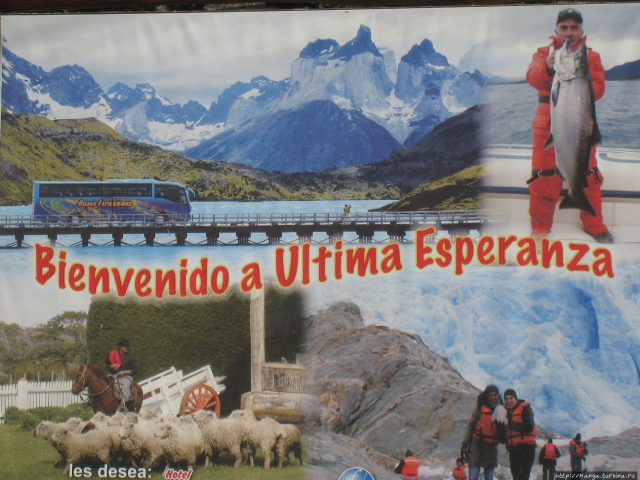 Небольшая набережная благоустроена, а на видном месте большой плакат с изображением туристических красот Патагонии, включая рыбалку, ледники, горы и стада овец.
