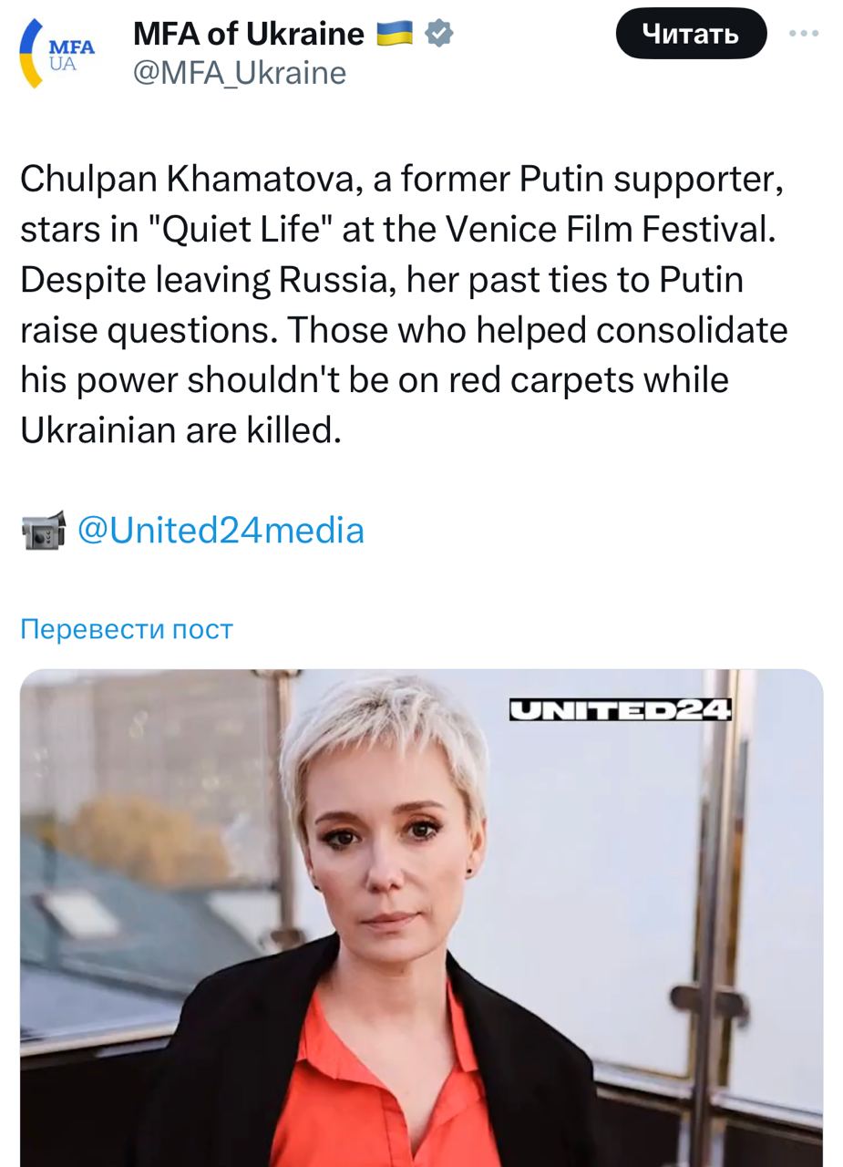 Министерство иностранных дел Украины требует запретить актрисе Чулпан Хаматовой участвовать в Венецианском фестивале.