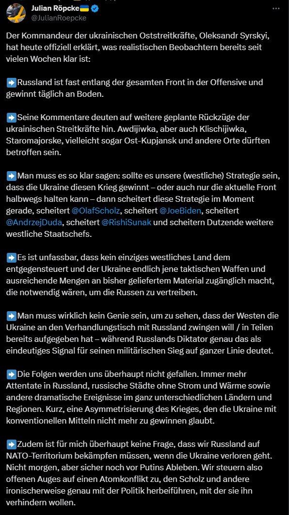 "Его комментарии указывают на дальнейший запланированный вывод украинских вооруженных сил. Это, вероятно, коснется Авдеевки, а также Клещеевки, Старомайорского, возможно, даже восточного Купянска и других населенных пунктов", - заявил Репке.