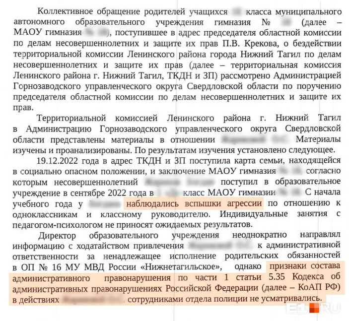 На этом родители не остановились и обратились даже в администрацию Горнозаводского управленческого округа, куда входит Нижний Тагил. Там ответили, что и директор гимназии, и родители других детей неоднократно направляли ходатайства о том, чтобы маму мальчика привлекли к ответственности за ненадлежащее исполнение своих обязанностей. Однако оснований для этого не нашли. Семья и так состоит на профилактическом учете в территориальной комиссии по делам несовершеннолетних (ТКДН).