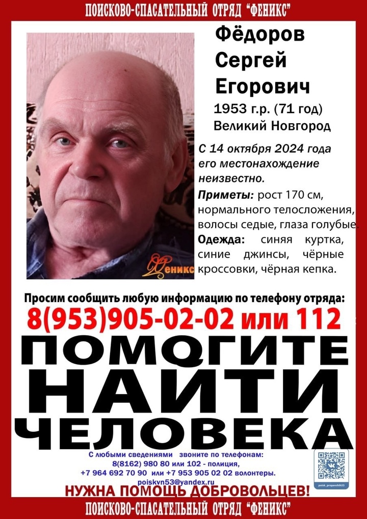 «С середины октября неизвестно местонахождение 71-летнего жителя Великого Новгорода Сергея Фёдорова», — сообщили волонтеры.
