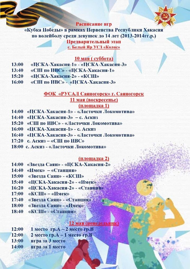 После вторых майских праздников в Саяногорске пройдет республиканский «Кубок Победы» в рамках первенства Хакасии по волейболу среди девушек до 14 лет. Соревнования состоятся 11 и 12 мая.