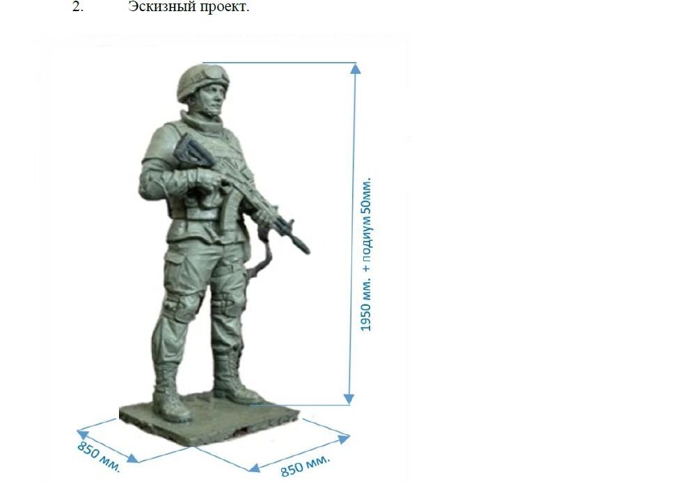 «Скульптура изображает солдата ВС РФ в полном снаряжении, на нем бронежилет с разгрузкой, шлем, боевая униформа в руках автомат АК, направленный стволом вниз. Солдат стоит прямо, его взгляд направлен вперед, выражение лица серьезное», — говорится в описании закупки.