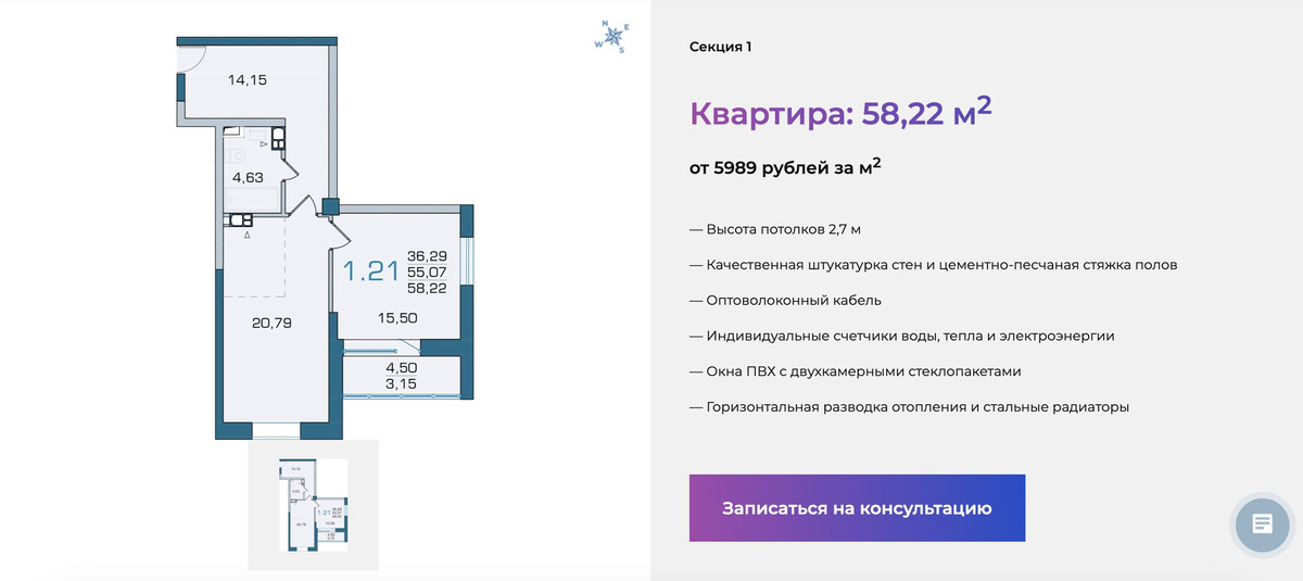 - 2 двухкомнатных квартир площадью от 84 до 97 квадратных метров. Здесь «квадрат» обойдется дешевле всего — от 5277 до 5732 рублей.