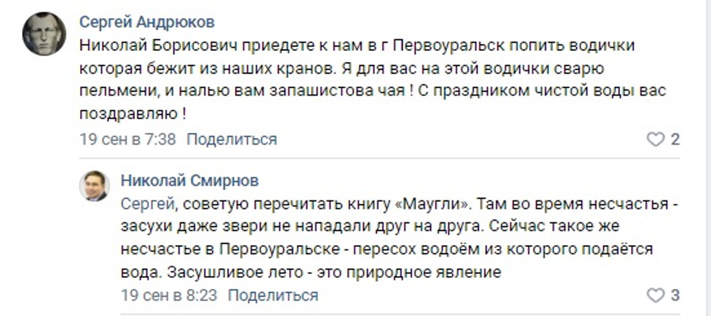 Кстати, из-за этой ситуации в центре скандала оказался областной министр ЖКХ Николай Смирнов. Он опубликовал на своей странице в соцсети серию красивых карточек в честь Всемирного дня мониторинга качества воды. Когда жители Первоуральска в ответ рассказали о своей проблеме и о работе местных коммунальщиков, он попытался призвать людей не ссориться, посоветовав прочитать «Маугли»: