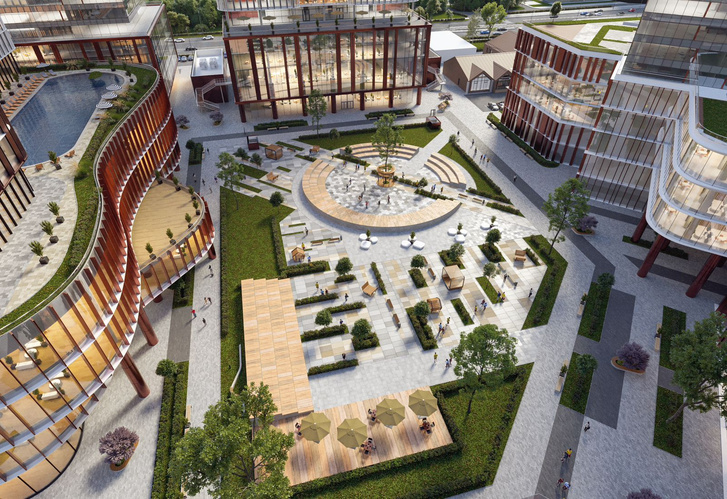Полностью квартал достроят к 2031 году. Тут будет пять небоскребов высотностью от 37 до 49 этажей — жилые и с офисными помещениями, а также гостиница и термальный комплекс с бассейном на крыше.