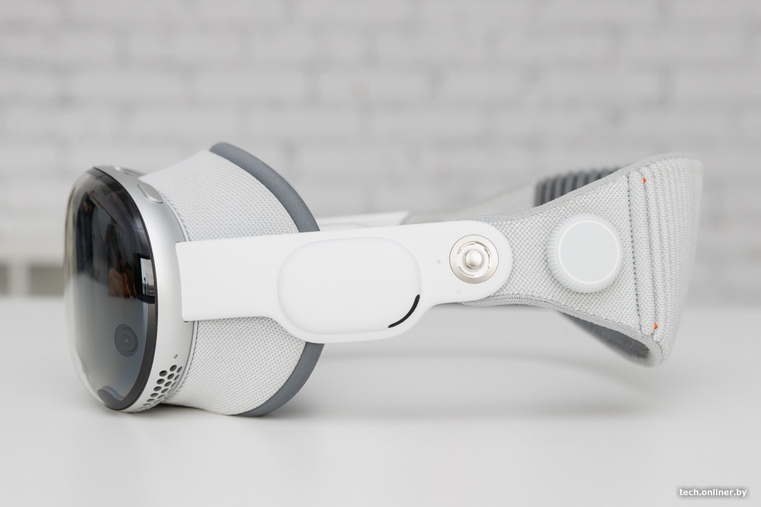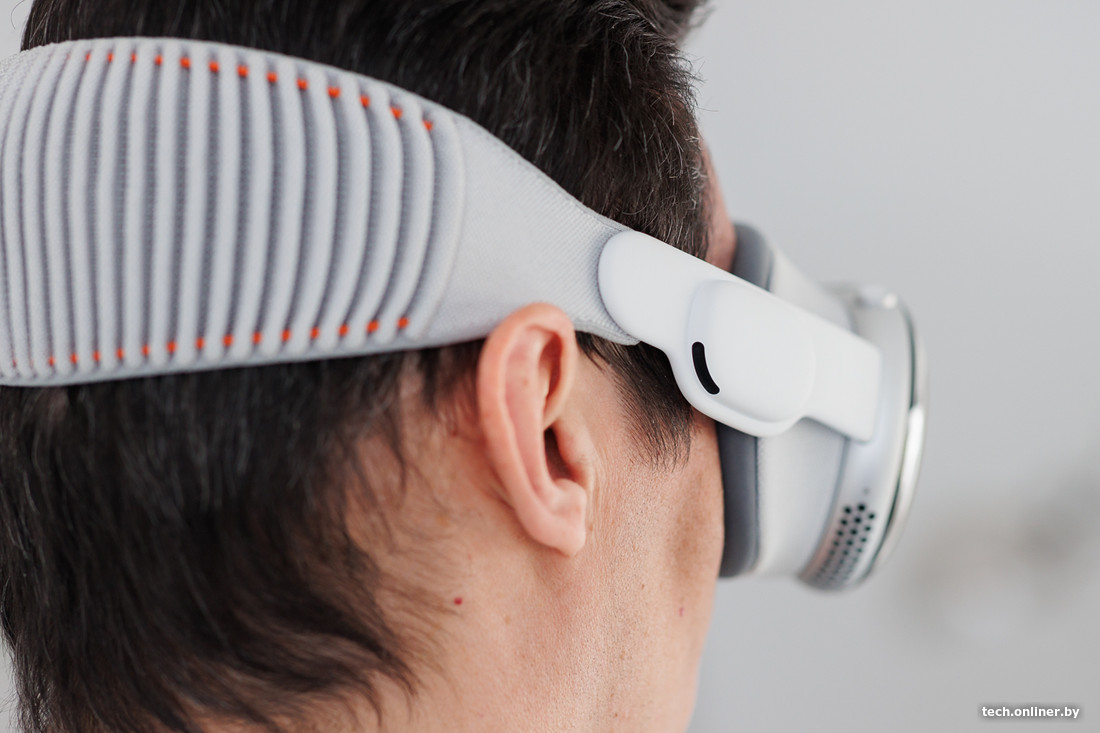 Шлем садится на лицо без лишних телодвижений, необходимо лишь подтянуть или ослабить ремешок с помощью шайбы слева, чтобы Vision Pro сидел плотно и не спадал. Примерно на этом этапе заканчивается универсальность: очкарикам вход запрещен.