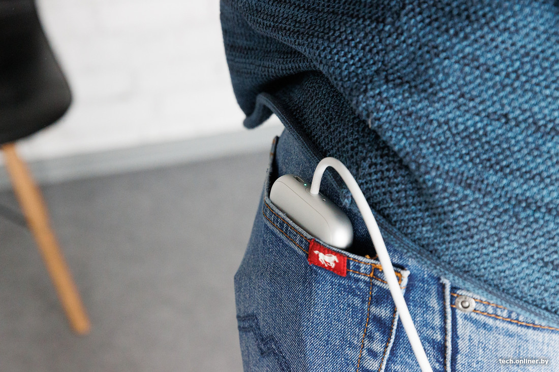 Следом задумываешься, куда положить внешний аккумулятор. Если есть карманы — вопросов меньше, но до момента, пока юзер стоит: сесть с кирпичом сложно, нужно вынимать и класть рядом, это касается и процесса работы или развлечений лежа. Находясь в VR, о кабеле забываешь, и, когда снимаешь шлем, появляется риск вырвать его с корнем, зацепив рукой: крепление представляет собой механическую застежку. Такое прочное соединение необходимо, так как встроенного питания у Vision Pro нет, и при отсутствии аккумулятора он сразу выключается. Заряда батарейки, следует из описания, хватит до четырех часов.